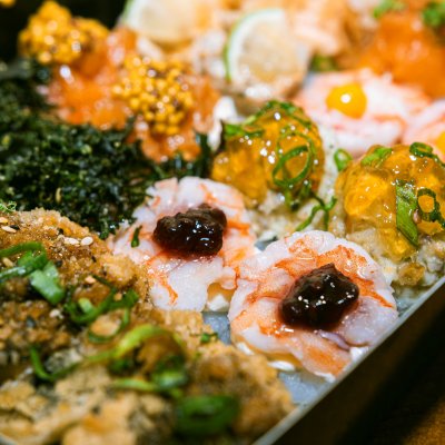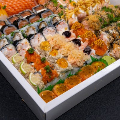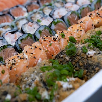 Sushis elaborados com base de arroz e o recheio por cima deles
