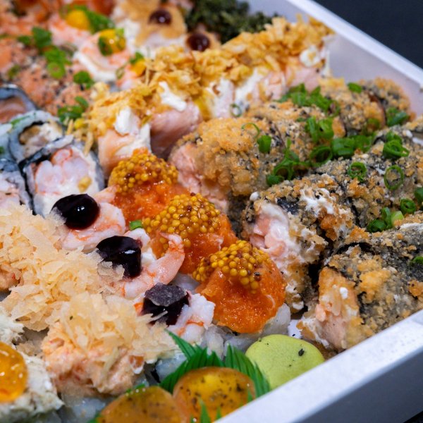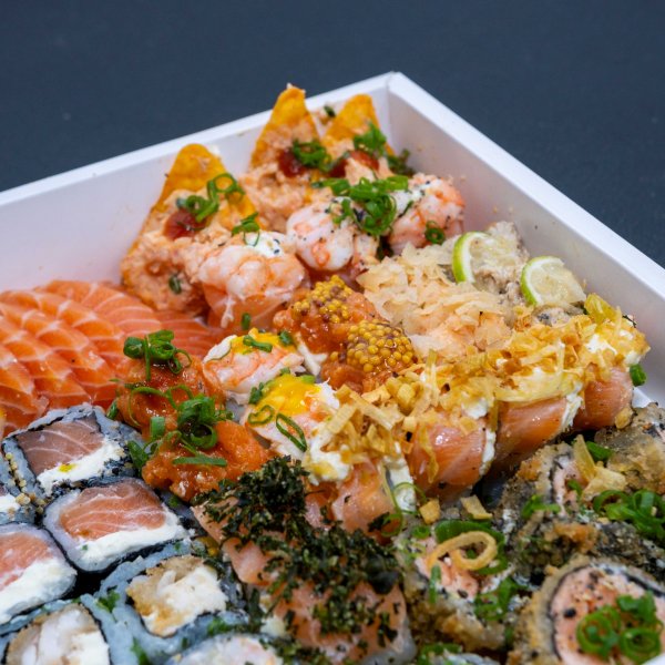 30 sushis patezinho com base de arroz e recheio em cima variados (3 de Tatake, 3 de patê skin com limão, 3 com patê tilápia e geleia de pimenta, 3 patê de salmão, Kani e Cream Cheese com crispy de harumake, 3 de camarão com geleia de jabuticaba e manjericão, 3 de Tatake com caviar de mostarda, 3 de salmão com Teriake, 3 de camarão com mostarda, 3 de tilápia empanada com barbecue, 3 de salmão com crispy de couve)