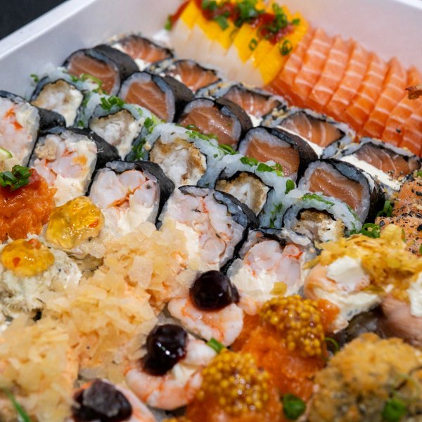 8 uramake base arroz recheio por cima, tatake salmão, patê salmão, kani e Cream Cheese, tatake com caviar de mostarda, patê de skin, filé de salmão com crispy de couve, camarão, salmão black