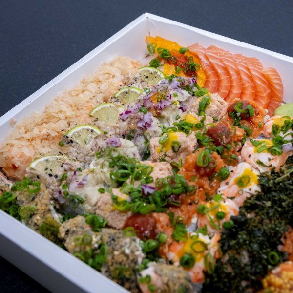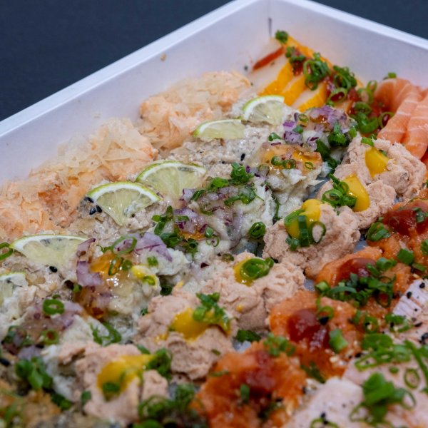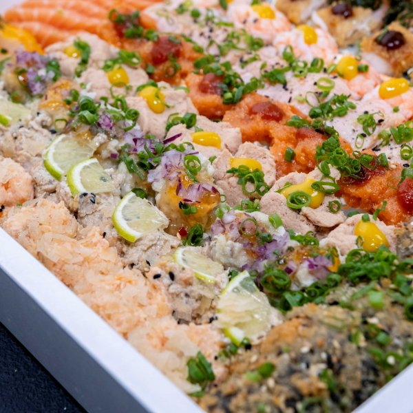 72 sushis com base de arroz e recheio em cima deles variados (de salmão, de patê de salmão com caviar de mostarda, de salmão com crispy de couve, de camarão, de patês variados)